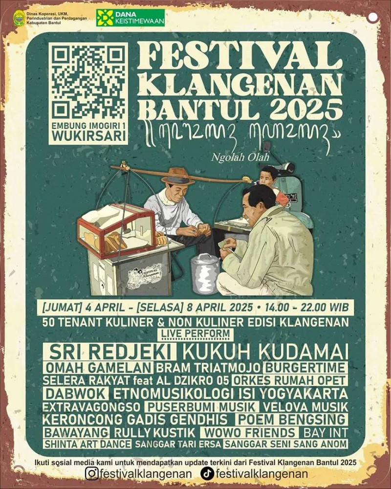 Festival Klangenan Bantul kembali hadir dengan mengusung tema “Ngolah Olah”. Digelar 4-8 April 2025 di Embung Imogiri 1, Wukirsari, Imogiri, Bantul mulai pukul 14.00 S/d 22.00 WIB
