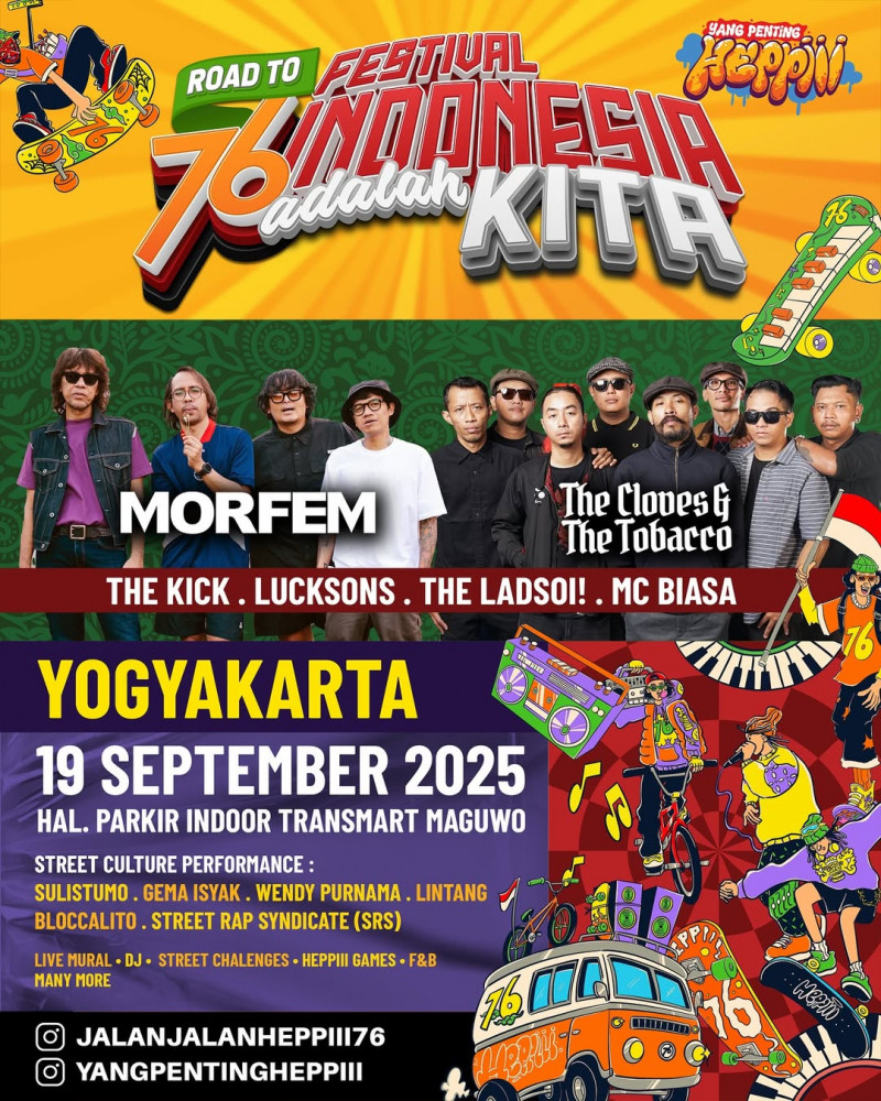 Acara street culture Road to 76 Indonesia Adalah Kita akan digelar di Halaman Parkir Indoor Transmart Maguwo, Yogyakarta pada 19 September 2025. Acara ini akan menampilkan @morfem_band,@theclovesandthetobacco, @thekick_, @lucksons.liberock, dan @theladsoi_yk.