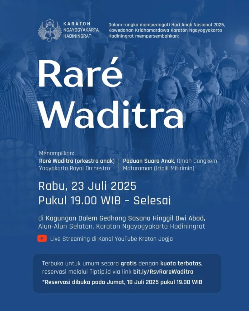 Kawedanan Kridhamardawa Karaton Ngayogyakarta Hadiningrat mempersembahkan Konser Raré Waditra Orkestra Anak Yogyakarta Royal Orchestra memperingati Hari Anak Nasional 2025.